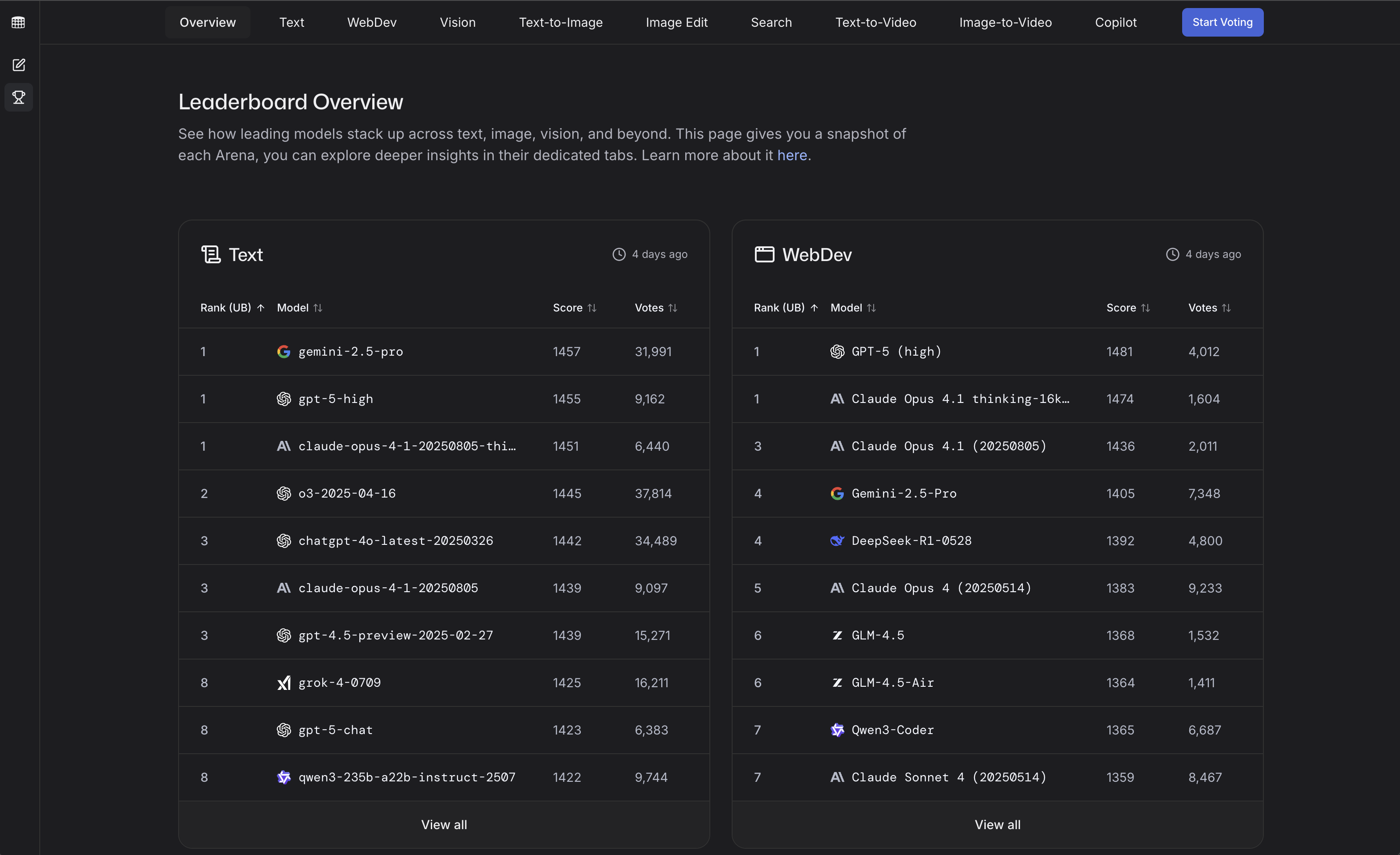 LMArena는 수 많은 인공지능 모델에 대한 평가 플랫폼입니다. 실질적인 사용자의 평가에 의한 인공지능 언어모델의 순위에 대한 리더보드를 참고하시면, 자신에게 맞는 모델을 찾는데 매우 만족스러운 플랫폼입니다. |