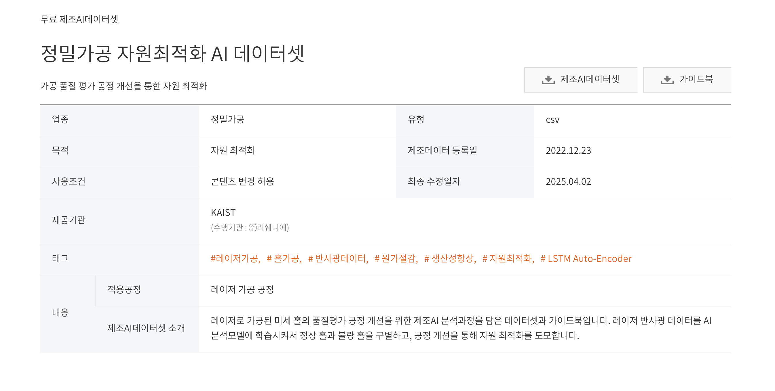 총 49개의 제조 데이터 셋중에서 정밀가공 부문 데이터셋 목록
